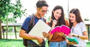 Asian Group of students sharing with the ideas for working on garden the campus lawn